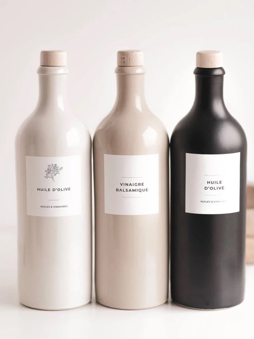 Nos bouteilles en grès beige, noir ou écru sont parfaites pour contenir vos huiles, vinaigres ou sirops. Leur design mat et minimaliste apporte une touche artisanale à la cuisine.